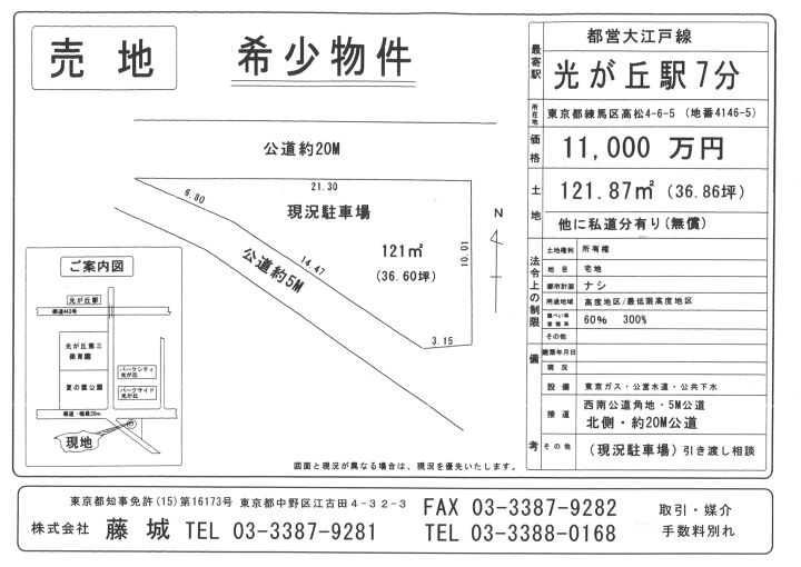 | 備考 | 北側20M・西南5M道路角地・建ぺい率60%容積率300%・防火地域です。